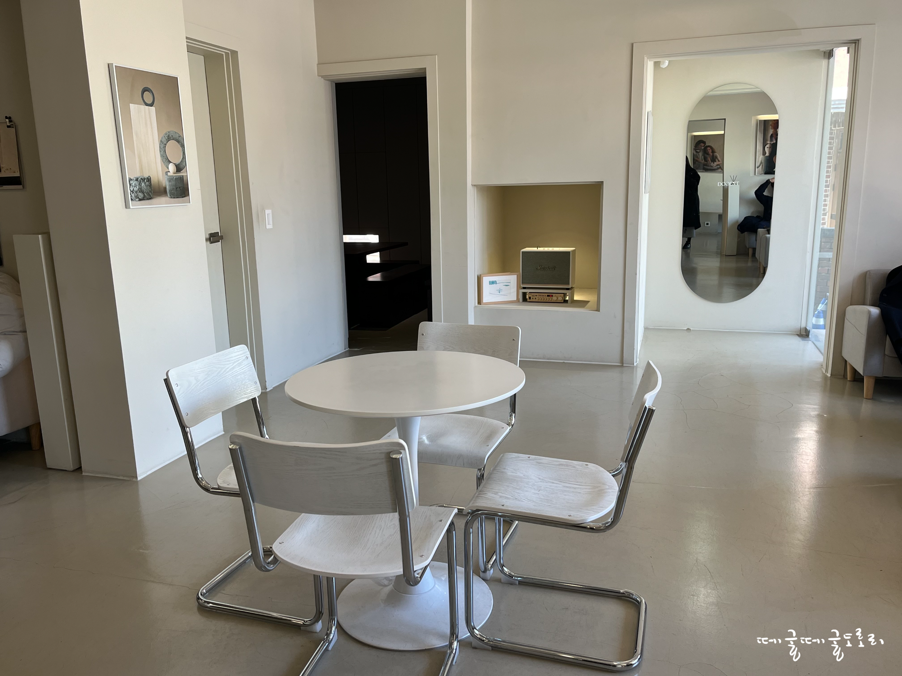 화이트 톤 의자와 테이블이 있고